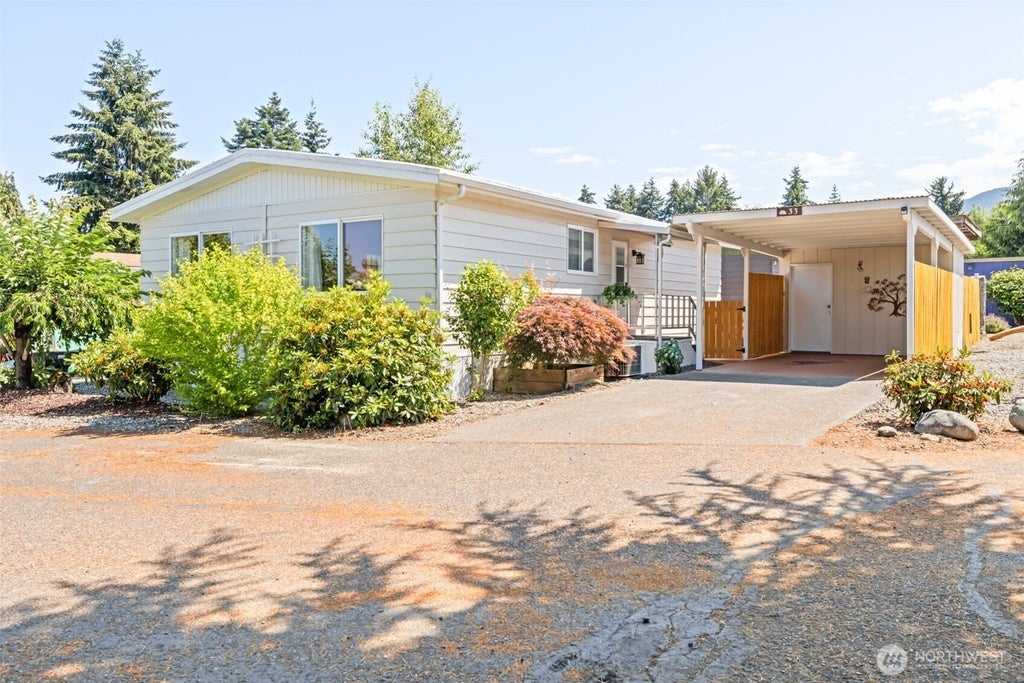 Walk in and feel like you are home! 1980 2 bedroom, 1 bath 960 sf. home on a large lot with covered carport and fenced backyard. Quiet, peaceful Hide-A-Way Park in a rural setting close to Sequim. Primary bedroom has a large walk-in closet. Very private with an outside porch, covered carport and large attached storage room with power for your hobbies or gardening. Fenced backyard area with large covered outdoor space for BBQ's. Nicely landscaped. New paint inside & out. Lots of recent upgrades, Heat pump too! Don't miss this beautiful, affordable home. 55 plus Community with Pets allowed with Park Approval.