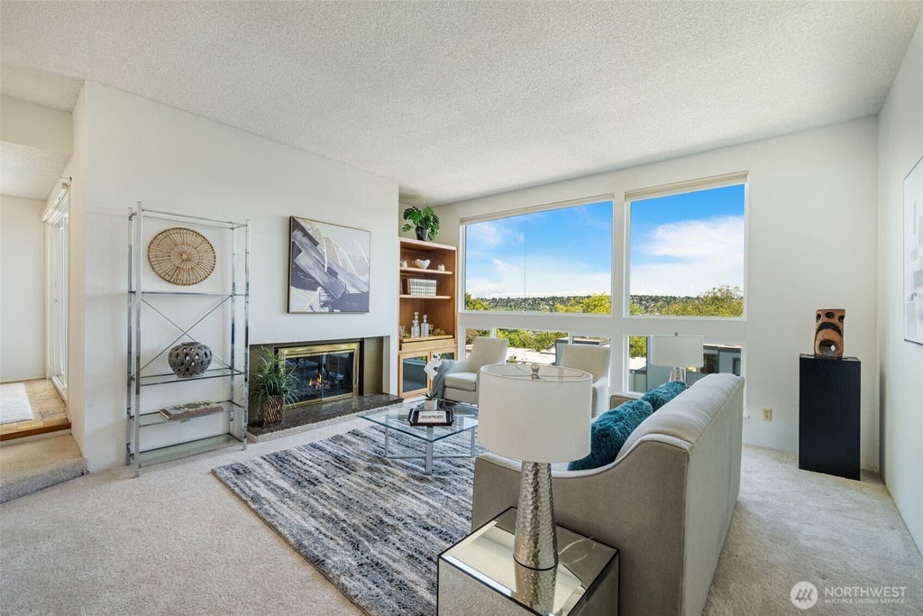 Enjoy sweeping, unobstructed views from this top-floor corner home at the Quarterdeck on Magnolia’s east slope. Floor-to-ceiling windows fill the home with natural light year-round. The smart layout features an open kitchen w/desk space, a sunken living room w/vaulted ceiling & wood-burning fireplace, separate dining w/built-in banquette, & access to a large private view deck. Spacious bedroom, full bath, in-unit washer/dryer. Fully renovated building with $8M+ in upgrades: new roof, siding, balconies, windows, and plumbing. Includes elevator access, covered parking, storage, heated pool, sauna, and community space. Pet friendly. Discovery Park, Lawton Park and an off-leash dog park nearby. Easy access to QA, Fremont, Ballard, and downtown.