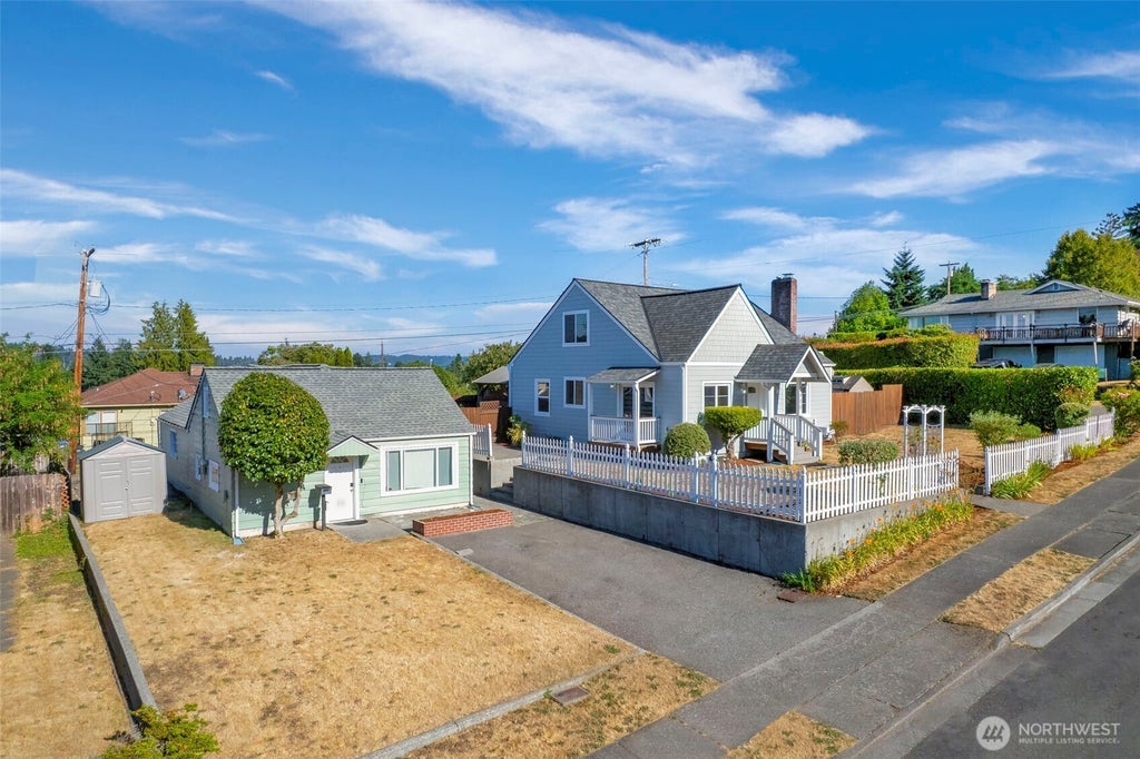 Fall in love with the charm and versatility of this rare double-lot property featuring a 4BD/2BA main home with 2 bonus rooms, detached garage & a storybook 1BD/1BA cottage. Cottage/DADU is 480sqft. Main home is 2550sqft. Newer roofs. Main home boasts fresh interior paint, new carpet, hardi-cement siding, beautiful original hardwood floors & a peekaboo water view. A white picket fence frames the property, leading to an expansive deck, outdoor brick fireplace, hot tub & lush garden space—perfect for relaxing or entertaining. Ideal for multi-gen living or investment. Homes are separately metered for versatile living or income potential. Live in one & rent the other!