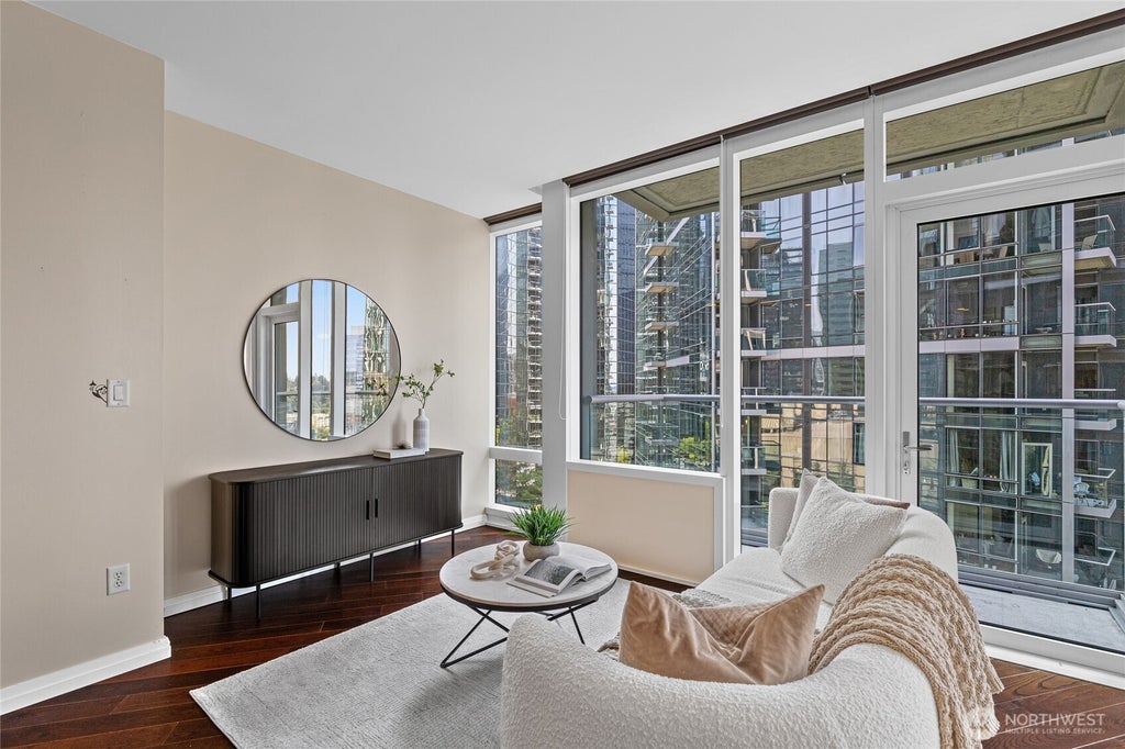 Step into this spacious studio featuring open-concept layout, 9' ceilings and abundant natural light from its desirable south-facing exposure. The sleek kitchen boasts an island perfect for entertaining, while the generous balcony offers an ideal spot to relax and take in the vibrant city vibe. Enjoy refined finishes like a marble bathroom floor, and take advantage of the building’s newly remodeled amenities - including a community lounge, theater, game room, fitness center, dining room w/ kitchen, spa w/ sauna and steam room, outdoor terraces, ½-acre private park and concierge service. Parking spot w/ EV charger. Just steps from top shopping, dining, and Bellevue Downtown Park—urban living at its finest. Seller offering $5k closing credit!