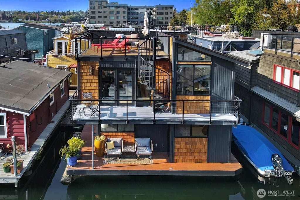 Chase your dreams and own a floating home in Seattle's famous waterfront community. This meticulously maintained 1970's home was just renovated in 2021. Never again will you compromise on space, light, and enjoyment. Two generously sized bedrooms located on the channel side and the third bedroom used as an office on the upper level. You'll love the over sized utility room so multifaceted, it can also be used as a dog washing station, exercise room, storage for your outdoor gear and more! Take your pick of three south facing decks for your viewing pleasure. The DOX community is comprised of 32 homes on a cooperative owned dock in the very popular Eastlake community. So completely move in ready all you have to do is enjoy fun in the sun.