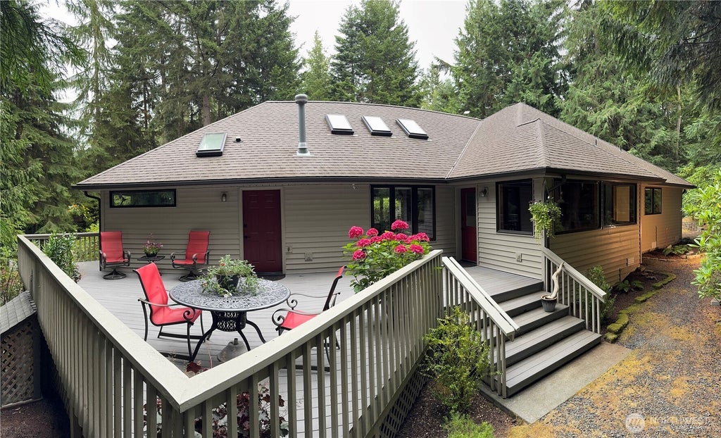 Wonderfully maintained 3-bedroom home nestled on a private and peaceful setting within Panorama Vista. Open Living with vaulted ceilings, skylights, hardwood flooring, and propane fireplace in the living area. Views of the trees, rhododendrons, and manicured landscaping from nearly every room in the house. Updated features include quartz counters, hardwood flooring, and stainless steel appliances. Spacious primary bathroom offers a custom tile shower, soak tub, walk-in closet, and heated tile floors. Large synthetic deck is perfect for relaxing or entertaining guests. Oversized 3-car garage and separate RV Parking area. Located near the Jamestown Tribal Center, and one mile from Miller Peninsula State Park West Trailhead. Must-see property!