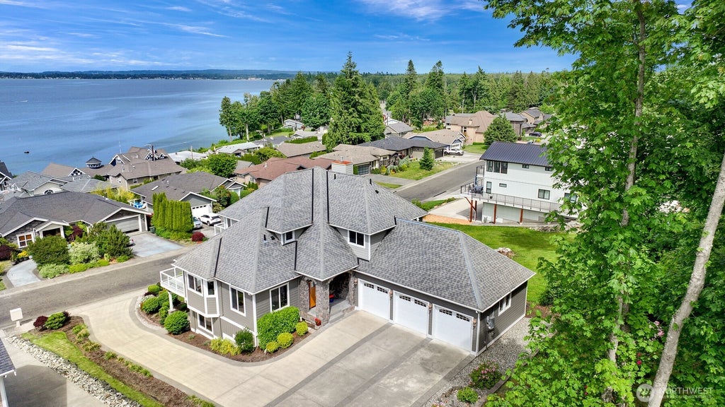 Uniquely beautiful home in the coveted Whitehorn neighborhood with sweeping views of the ocean, mountains, and stunning sunsets from EVERY floor. This custom 4BD/3.75BA JWR-designed home offers a flexible layout ideal for guests or multigenerational living, with a lower-level kitchenette and whole-house surround audio. Premium finishes include slab granite, rich hardwoods, hemlock-wrapped trim, dual-fuel chef’s range, formal dining, central vac, and a whole-house generator. Beautifully landscaped with irrigation, 3 car garage, deeded beach access, and a spacious deck perfect for entertaining—this home truly captures the best of coastal Pacific Northwest living.