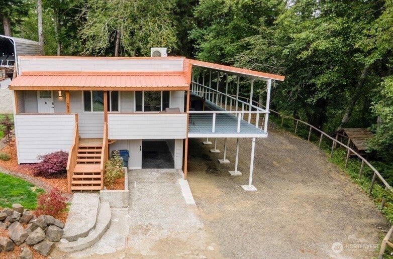 This charming three-bedroom, two-bath home has been thoughtfully renovated to blend modern comfort with classic appeal. Step onto the expansive porch and enjoy serene views of the green belt (25 mature cherry trees!) and a glimpse of the Wishkah River. Inside, the fully finished basement offers a cozy bedroom and ample storage space, perfect for guests or additional living space. The property also includes a convenient one-car garage. Tucked away in an ultra low traffic area creating a safe and quiet environment! Includes efficient heating and cooling, induction oven, fiber internet, and much more! This beautiful home is ready to welcome you!