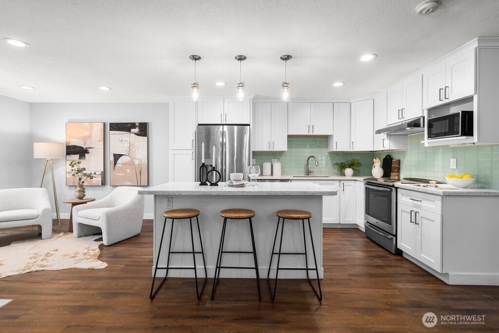 Discover this stunningly designed single story end unit Bothell home. Open concept 2 bedroom, with over 1,200 sqft of stylish living space. Easy one step entry. Modern kitchen with White Shaker Cabinets, Quartz counters, Stainless Steel Appliances & tile backsplash. Cozy brick fireplace. Recessed lighting & LVP throughout. Outside enjoy a well maintained community, fresh exterior paint & newer roof. Back patio leads to plenty of grass & space to play. Rare community with a low/strong HOA. Highly rated Northshore schools including Bothell HS. Easy access to I-405/5 makes commuting a breeze. Whether you are looking for a turn key investment, first buy, or to downsize, these opportunities don't come along often. Pre-inspected & Ready to Go!