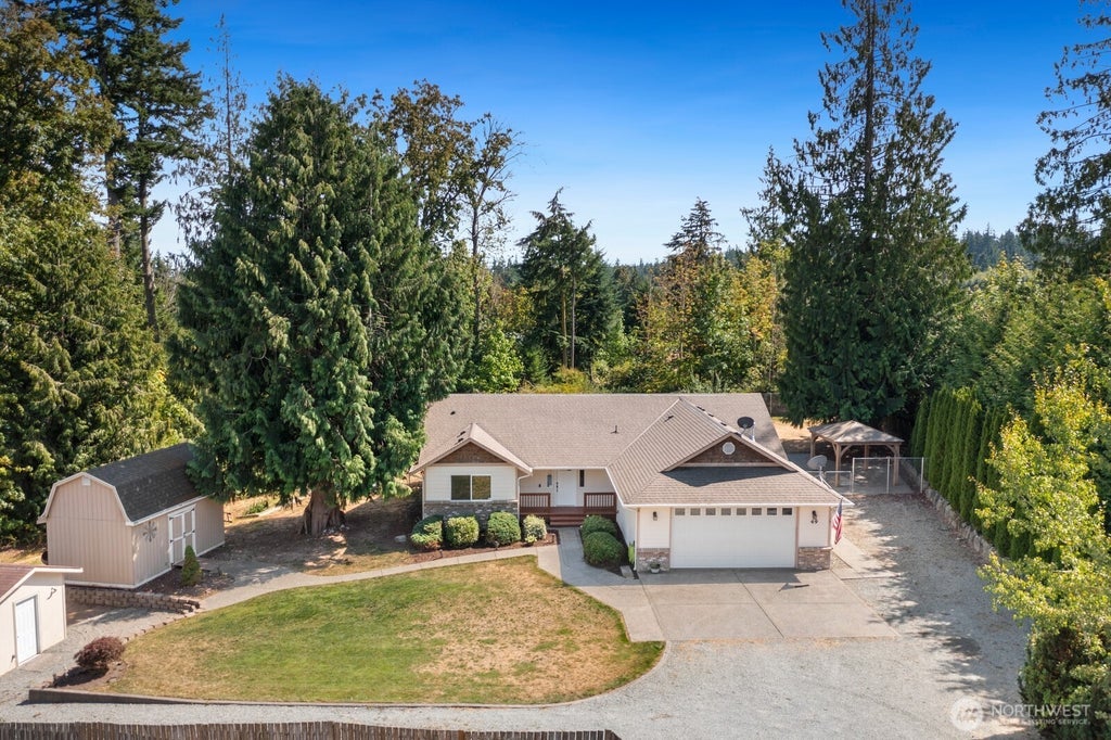 One level living at its best! Fresh, clean & move in ready. Open floor plan with vaulted ceilings & an abundance of natural light in the main living & kitchen area with large windows, vaulted ceiling & sky lights. Many updates throughout- New carpet, paint, LVP flooring, stainless steel appliances. Heat Pump-keeps you cool in the summer & warm winter. Covered back deck & extensive patios are just a couple of the inviting spaces to enjoy the peace & serenity. Mature landscaping on a private level lot 1+ acre lot with plenty of parking for extra cars, RV/Boat & Huge shed for extra storage/shop area. Fruit trees, garden space & a gazebo ready for an outdoor kitchen. Quick access to trails, parks, beaches & shopping make this one a winner!