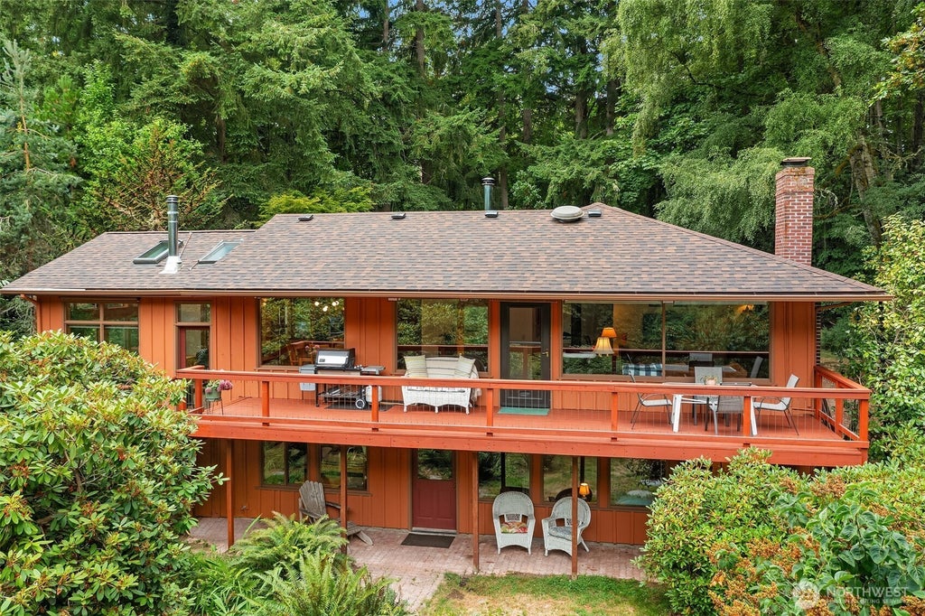 Mid-Century Home Meets Vashon Vibe. Step into this 1952 gem offering 4 beds, 1.75 baths, and nearly 2500 sq ft of inviting living space. Thoughtful design details include expansive windows, rich fir doors & trim, limestone & brick façade fireplaces, and timeless hardwood floors. The fully finished daylight basement includes a private primary suite & guest bedroom. A bonus room w/walls of windows and a cozy woodstove opens directly to a sunny southern aggregate patio that flows seamlessly into an expansive east-facing deck. The deck offers views of the expansive lawn, towering rhododendrons, lilacs, and fall-color specimen trees. Enjoy the privacy & sunlit grounds-just 1 mile from town. If you're dreaming of a Vashon lifestyle, this is it!