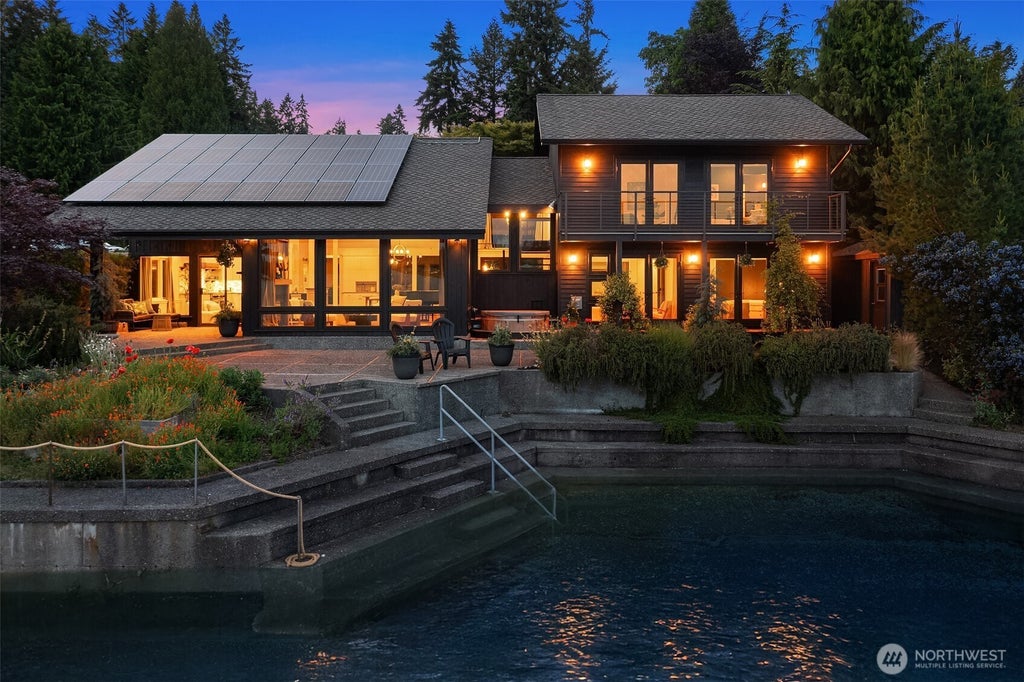Located on desirable Quartermaster Drive, this 1.47 acre estate stretches from street to shoreline, capturing breathtaking 180-degree views of Mt. Rainier and the harbor, all bathed in coveted southern light. A grand maple, orchard, and flower gardens set the tone for elegance. Inside, soaring ceilings and walls of glass frame the view with open concept living, while the primary suite offers a private balcony and spa-like bath. French doors in guest rooms open directly to the shoreline. A stylish flex space/workshop enhances versatility. Amphitheater-style steps descend to 80 feet of pristine low-bank waterfront, complete with a swim dock, private buoy, and charming boathouse—offering the pinnacle of Pacific Northwest waterfront living.