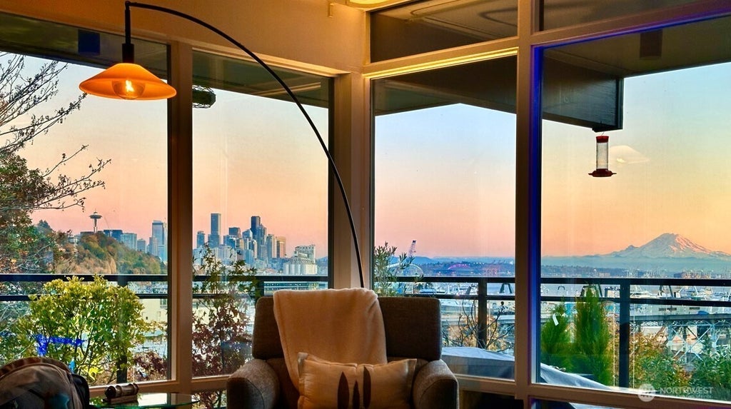 Prepare to be captivated by this fully renovated, extraordinary, mid-century modern home nestled on a greenbelt offering privacy & unobstructed vistas from Uptown, Space Needle & downtown skyline, to majestic Mt. Rainier. Each detail meticulously designed by its architect-owner, the single-level plan lives like a luxury home. Custom Sapele cabinetry sets a tone of timeless quality, complimented by new hdwd/porc. floors, high-end appls & two stunning stone fireplaces. Floor to ceiling windows, extensive storage, lg walk-in closet & laundry make condo living effortless. This 1700 sf home extends seamlessly to a 440 sf private deck & tree top views. A turnkey unit in a fully renovated blg. offering a low-maintenance lifestyle & peace of mind.