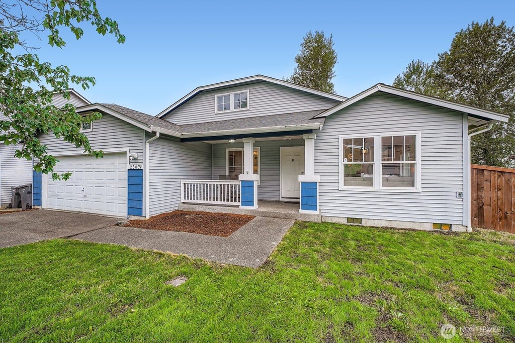 One story with a full finished daylight basement offers loads of square footage and backs to private open space (owned by HOA) Spacious main floor has a den/office just inside the front door, a great "work from home" space. Open kitchen features white cabinets and quartz counter tops. Large adjoining living room and family room with a gas fireplace for cozy evenings at home. Main floor primary suite has a private bathroom and walk-in closet. Stylish "distressed wood" look laminate flooring throughout the main level. Basement has a huge rec room, two bedrooms, a full bathroom and a bonus room that would make a great home gym or theater room. Fully fenced backyard has a party sized deck with stairs to the yard all backing up to wooded privacy