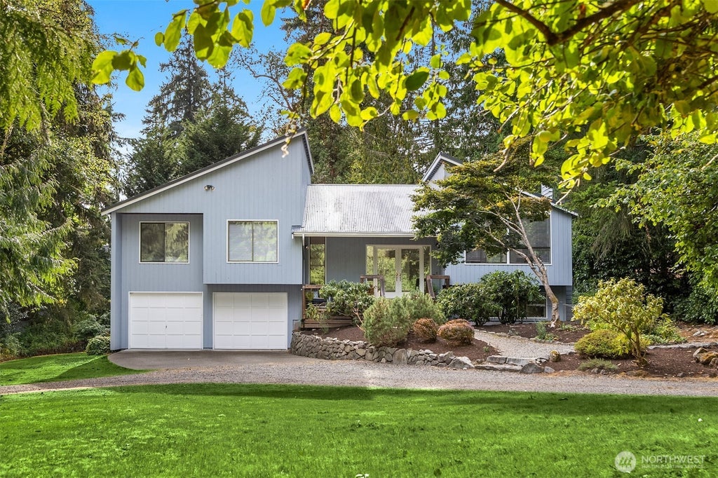 Quiet 3 bedroom awaits down a long, private driveway. Nestled on 1-acre of surrounding green, this light and airy home boasts vaulted ceilings, Western exposure, 2 fireplaces, 2 master bedrooms, a cozy, private downstairs den and large, multi-level deck with French Doors to enjoy the serenity of tall evergreens and peek-a-boo view of the Puget Sound. Low maintenance landscape with additional maple and fruit trees promises a colorful palette of nature's beauty through all seasons. New carpets make this home ready for its next owners to make it their own.