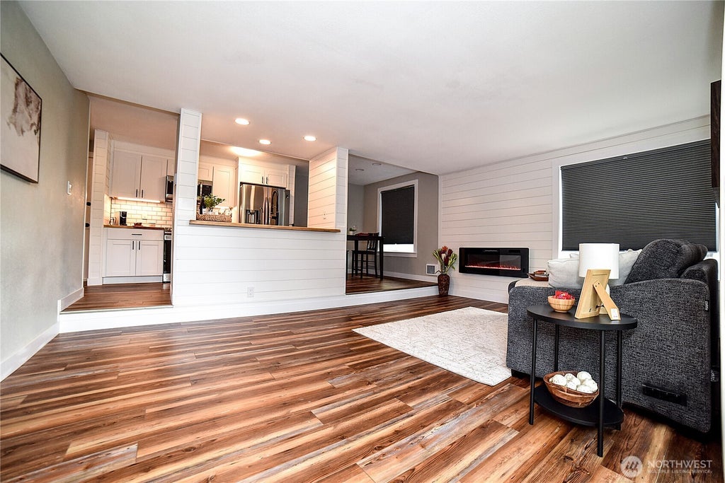 Fully updated, fabulous sunny and spacious North City, condo with great room concept - feels like new construction - minutes to the 185th Street Light Rail Station! Gorgeous pass thru Kitchen, everything less than 2 years old: cabinets, stainless steel appliances, butcher block countertops - open to the dining & spacious living room with Shiplap accents & a cozy electric fireplace. Large bedroom with roomy closet & full-size washer and dryer. Luxurious spa-like bathroom! Extra storage closets, updated electrical throughout, LVP Flooring, and too many features to list! Garage parking, smart garage opener. Guest parking, storage unit, lovely clubhouse, sauna, and patio! Restaurants & shops nearby! You will love living here! Pet friendly!
