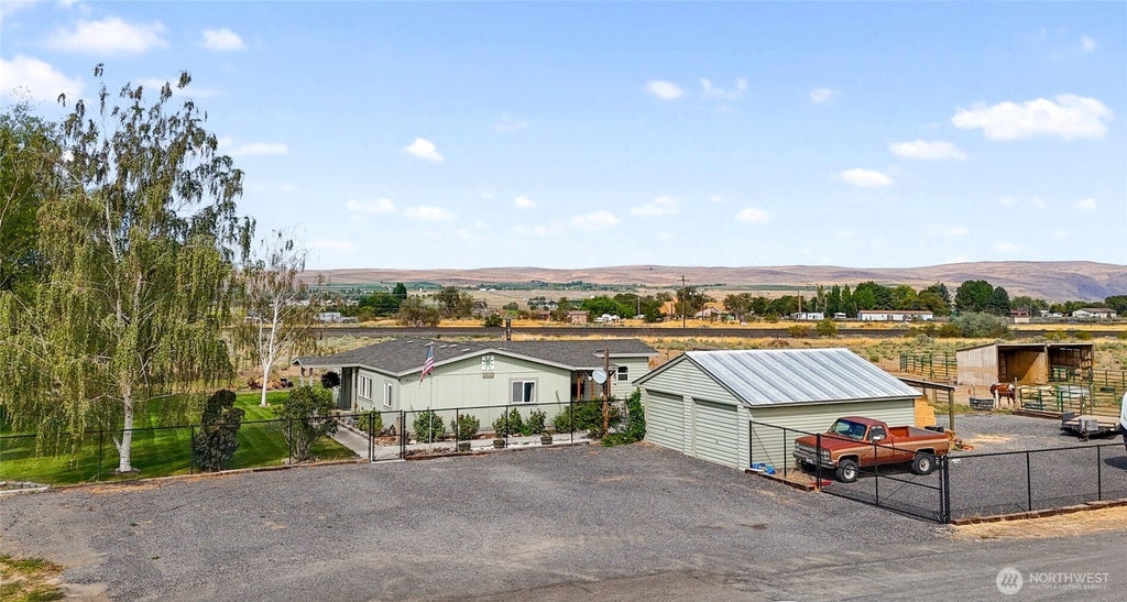 Manufactured home with a permitted addition giving 1490 sqft, 3 Bedrooms and 1.75 Baths located just outside of Soap Lake on 3.8 acres w/ an addit .77-acre parcel. Property includes a detached 2 car garage, covered patio, outbuildings and lots of parking. There is a nice chicken coup, fenced garden with raised beds, wood shed and a nice area for horses or small livestock. Lots of updates inside and out including newer roof, HVAC and 40 gallon water heater, hickory cabinets, SS appliances, laminate floors, updated bathroom. Tall chain link fenced yard, lots of beautiful landscaping. Properties like this don't come along often so don't wait to see it! Ephrata School District or Soap Lake.