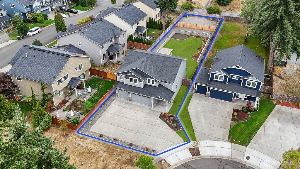 Modern convenience w/spacious outdoor living! This 5bd 3ba haven sits at the end of a cul de sac next to cmty park. Inside, soaring ceilings & custom lighting create warmth & openness. The kitchen blends function + style w/quartz counters, WP applncs, & designer fixtures. Unwind in a private jet tub off the main bd. Lg windows fill the home w/ntrl light, enhanced w/remote blinds on the upper panes & a gas FP adds evening comfort. Outside, tiered landscaping w/Japanese maples frame several areas to relax, garden, or entertain. An extra enclosed area w/greenhouse & gate on Cullens Rd expand options for hobbies & projects. W/custom flair, inviting spaces, walking dist to schools, & easy commute to JBLM & I-5, this home combines comfort w/ease.