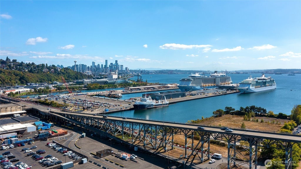This extraordinary home is top floor of a tri-plex overlooking the cruise ships. Mid-century modern style nestled on a greenbelt offering privacy & unobstructed views from Uptown,Seattle skyline, to majestic Mt Rainier. This single floor penthouse lives like a luxury home offering excitement of city activities from a peaceful Magnolia setting. Fully remodeled w/a deck 2 full sides of the unit ,2 entries & 4 parking spots. Lg. open living/dining/family room plan offers high cathedral ceilings, full glass walls, electric shades & sandstone fireplace. Lg. kitchen w/Italian granite counter tops, Sapele cabinets, & stainless appls. Brazilian Quartzite shower & sauna in primary bath w/hardwood floors throughout. This treetop home is breathtaking!