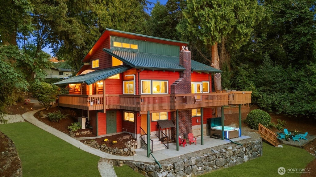 Custom-built Pacific Northwest contemporary designed to embrace nature & capture breathtaking Olympic Mtn sunsets. Tucked away on nearly an acre of lush forest, this retreat offers vaulted ceilings, cozy gas fireplaces, & an eat-in kitchen w/ pantry, storage, & sunny solarium. Entertain on the expansive 1000SF deck, patio w/ hot tub setup or enjoy the large turfed yard. The extraordinary primary suite features vaulted ceilings, a lofted reading nook, & a spa-like bath w/ zellige tile, heated floors, marble counters, & alder vanity. Flexible downstairs MIL includes kitchenette, separate entry, sauna, & heated-floor bath. All major systems updated for peace of mind. Privacy here is unmatched—just forest, light, & unforgettable sunsets.