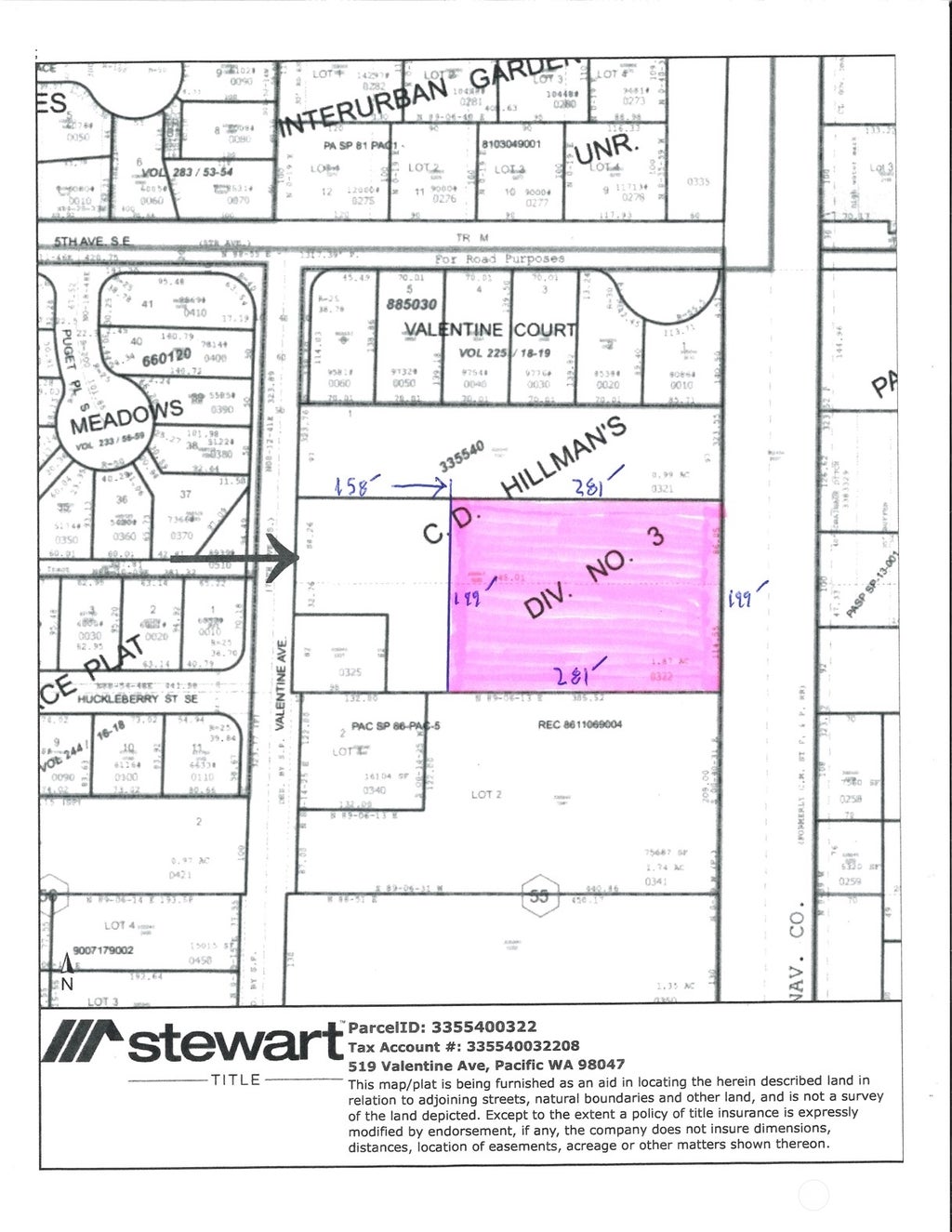 1.28 acres of level and cleared land; utilities available in street. Sold subject to short platting and revised title; survey and short plat process to be Buyer's responsibility. Buyer to have and maintain liability insurance to cover Buyer adequately during survey/short plat process. Adjacent .99 parcel concurrently for sale with another cooperative Seller with separate Realtor; MLS# 2167661; suggested highest and best use would be for Buyer to obtain both parcels.