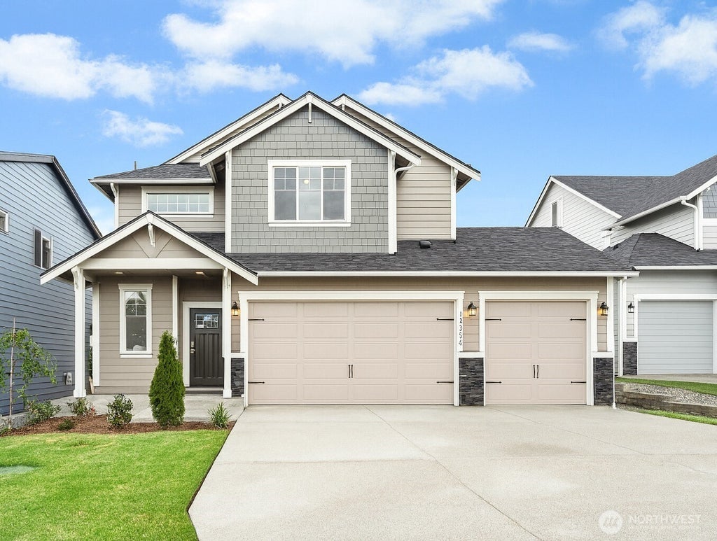 $18K Buyer Bonus! Use toward a rate buy-down or closing costs! The Blossom at Mountain Meadows is move-in ready and built for today’s living. The great room features a cozy gas fireplace with built-in cabinets, opening to a bright kitchen with white shaker cabinets, quartz counters, subway tile, and stainless appliances. Main-level guest suite with ¾ bath. Upstairs: spacious primary with soaking tub, walk-in shower, dual sinks, and walk-in closet, plus 3 more bedrooms, full bath, and utility. Enjoy a landscaped backyard with covered patio, heat pump for year-round comfort, and a 3-car garage. Builder offering move-in package that includes Washer/Dryer, Fridge & Blinds. Just minutes to Hwy 512 & JBLM!
