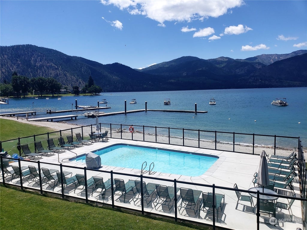 Watch July 4th Fireworks from your private deck in 2026! Buy NOW & use June 1-8 (2 nights June week rented. Net income to buyer $252) & Sept 28-Oct 5 in 2025; March 1-8, Holiday Week June 28-July 5 & Oct 25-Nov 1 in 2026. AWESOME LOCATION with sandy beach, boat moorage, swimming pool and lawn in your front yard! Upper Level 2 bed 2 bath condo with unobstructed lake & mountain views. Remodeled in 2022 with high end finishes. Purchase 3 rotating weeks every year. HOA fees only $895 per quarter. Use your weeks, rent for income or trade through RCI or Interval International & visit other places. Purchase includes use of boat docks, slips, buoys, pools, tennis/pickle ball, sandy beaches & more! 2 blocks to downtown Manson wineries, restaurants