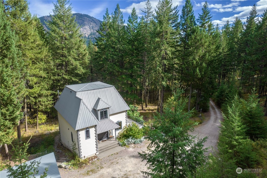 Schloss Mazama! bordering Okanogan National Forest offers extreme privacy, minutes from Mazama Junction. 3bed 3.5 bath 2400sf+ home features a main living level, upper bedroom area, and lower recreation and utility rooms. Everyone can retreat to their own space in winter, or gather in the great room around the propane stove to watch the snow fall. New HVAC system & hot water tank installed in 2024. Open floorplan design, high ceilings, and ample windows for natural light to stream in. Over 3 rolling forested acres, not part of an HOA, you can't see anyone from your home. Walk from your front door into thousands of acres of National Forest. Year round Mazama trail system is close by for walking, biking, horse riding, and nordic skiing.