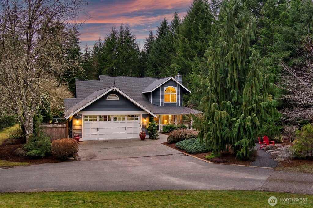 Sited on sunny 2.35 acres, your own private oasis awaits. 2,374sf principal dwelling boasts a spacious main floor primary suite with renovated bath. Formal dining & living spaces, & main level office w/an inviting river rock fireplace. Bright open kitchen w/white shaker cabinetry, new stainless appliances & sunny breakfast nook. KPUD fiberoptic for fast internet! Soaring cedar ceilings & natural pine floors reflect warm ambient light. Architecturally striking central staircase winds up to additional beds & bath. Separate 880sf guest retreat features full kitchen, bed, updated bath & new LVP flooring! 1,000sf detached shop, perfect for hobbies or extra storage! Stunning established grounds w/private trail. Minutes to the Kingston ferry!