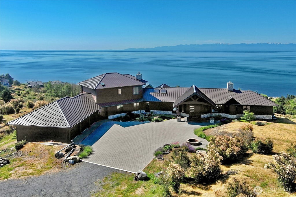 Incredible forever water and mountain views plus great whale watching from this south-sloping hillside setting offering all-day sun! Beautifully designed custom home with 4517 sf, 2 primary bedrooms, 6 total bathrooms, self-contained 2nd floor guest suite, separate rec room or studio, exercise room with cork flooring, 3 propane fireplaces, laminated double pane storm force windows, 10 ft ceilings, central vac, on-demand hot water, fiber optic internet, solar panels, extensive Ipe wood deck, brick paver driveway, 786 sf guest house, 1008 sf 3-bay garage with 240v outlet, Tesla power walls, private well and community water, fenced garden with concrete raised beds and upscale shed, 6.79 acres, and beach rights. Attention to detail throughout!