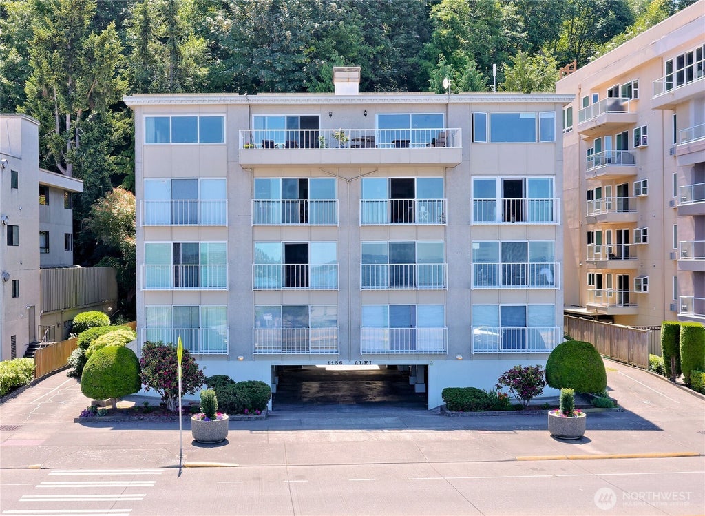 VIEW, VIEW, VIEW! Experience destination living at its finest, where sweeping vistas of Puget Sound meet the iconic Seattle skyline. Just steps away from Alki's top restaurants, sandy beaches, and the Water Taxi for a quick trip to downtown Seattle. This urban oasis boasts a fully remodeled kitchen and bath, with modern updates throughout. Additional conveniences include W/D hookups off the kitchen, basement storage and guest parking. Savor panoramic waterfront views from the open lanai, enjoy in the community gardening space, or launch your kayak right across the street.
