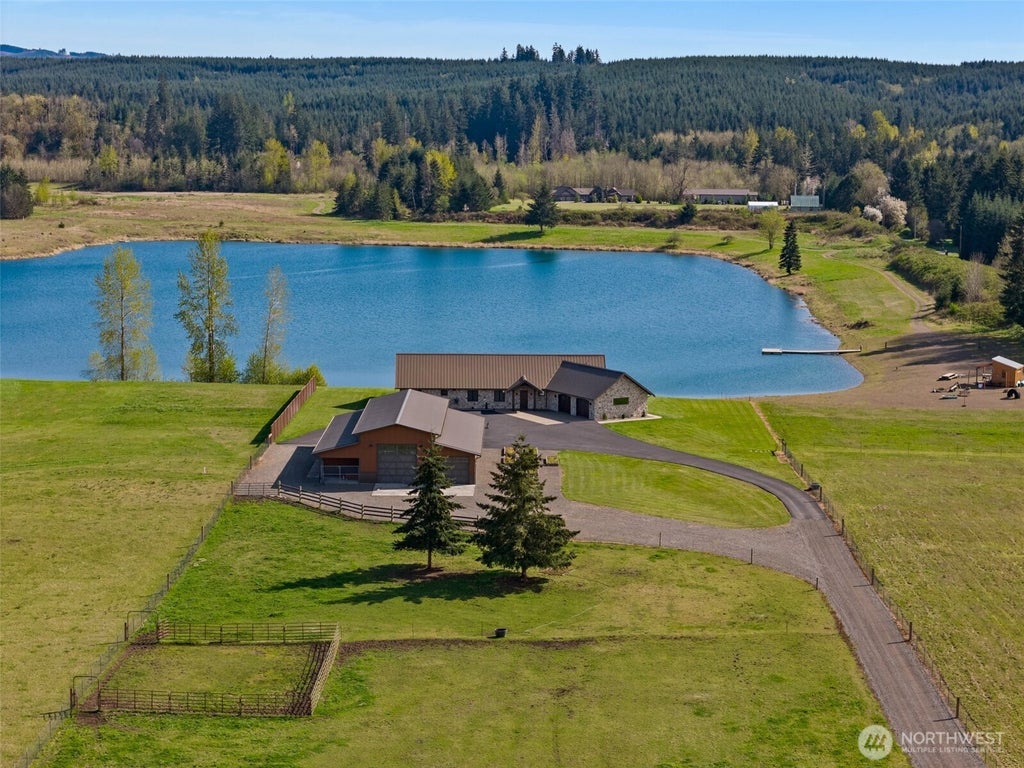 Incredible opportunity to own a private lakefront estate on acreage, offering stunning views, vibrant sunsets, & complete seclusion—all just 25 minutes from Olympia. This custom-built rambler seamlessly blends luxury and comfort w/open concept design, high-end finishes, heated concrete floors, gourmet kitchen, spacious primary suite & sauna room. Step outside to a heated covered patio w/firepit, overlooking the lake and your own private dock. This beautiful property features a 4,500 sq ft shop, gated entry, fenced pastures, & garden area—ideal for animals, hobbies, & recreational use. Enjoy fishing, kayaking, boating, & personal watercraft on Valley Lake, a 100-acre private lake w/ no public access. Luxury lakefront living at its finest!