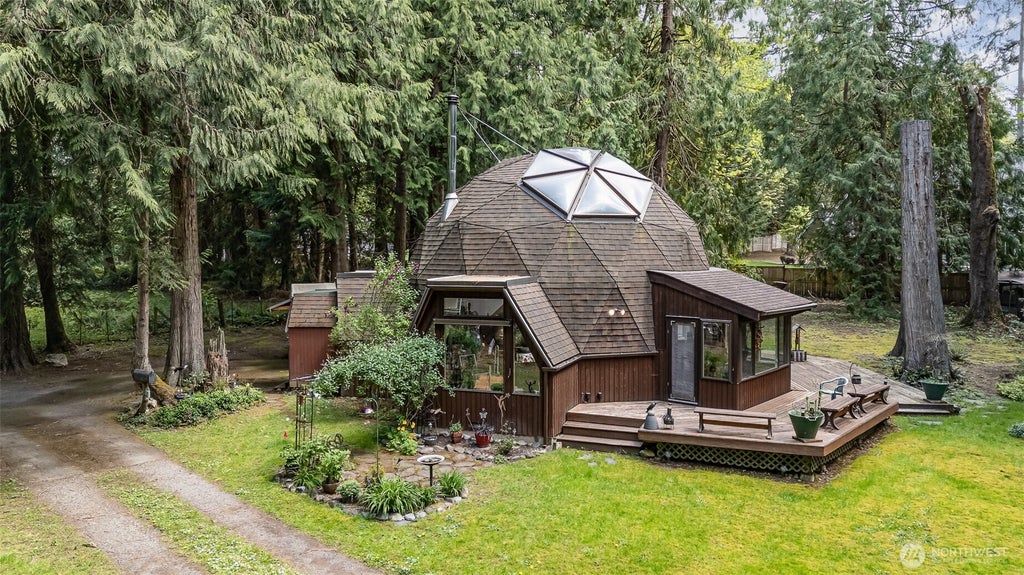 Discover a truly unique opportunity in the heart of Sammamish Plateau! This impeccably maintained geodesic dome, offering 1 BR and 1 BA over 1300 sqft, is situated on a secluded, gated and fully fenced .81-acre flat lot. The Dome features include structural updates, custom sheds, a heated ceramic tile bathroom floor, and an inviting open concept, creating a move-in ready sanctuary. Enjoy the vibrant scenery with blooming flowers and ample space, all while contemplating future projects or building your dream home. A rare gem combining innovation, privacy, and potential awaits! Don't miss your chance to see this amazing property. VALUE IN LAND!