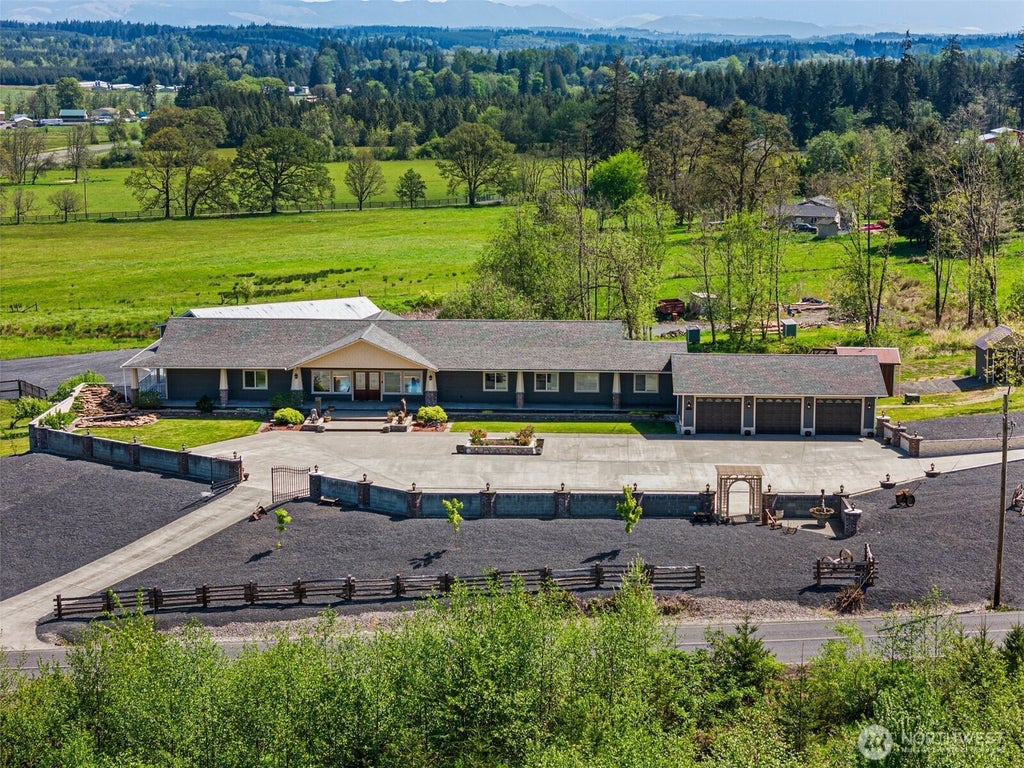 Incredible home on nearly ten acres on the market for the first time. No detail was left unnoticed when designing this home and property with custom details from top to bottom. The Home offers an open living space with an oversized main living area, oversized island, and a separate bar area for entertaining. All bedrooms are on the main floor with a bonus pool/game room downstairs. Grand courtyard as you drive up with a wrap around deck providing views of classic barns and farmland and an incredible view of Mt. Rainier and the surrounding hills. The property offers a separate entrance for the shop (40x100) and barn/shop (60x64) leaving the option for a home business or just using the storage space for personal use.