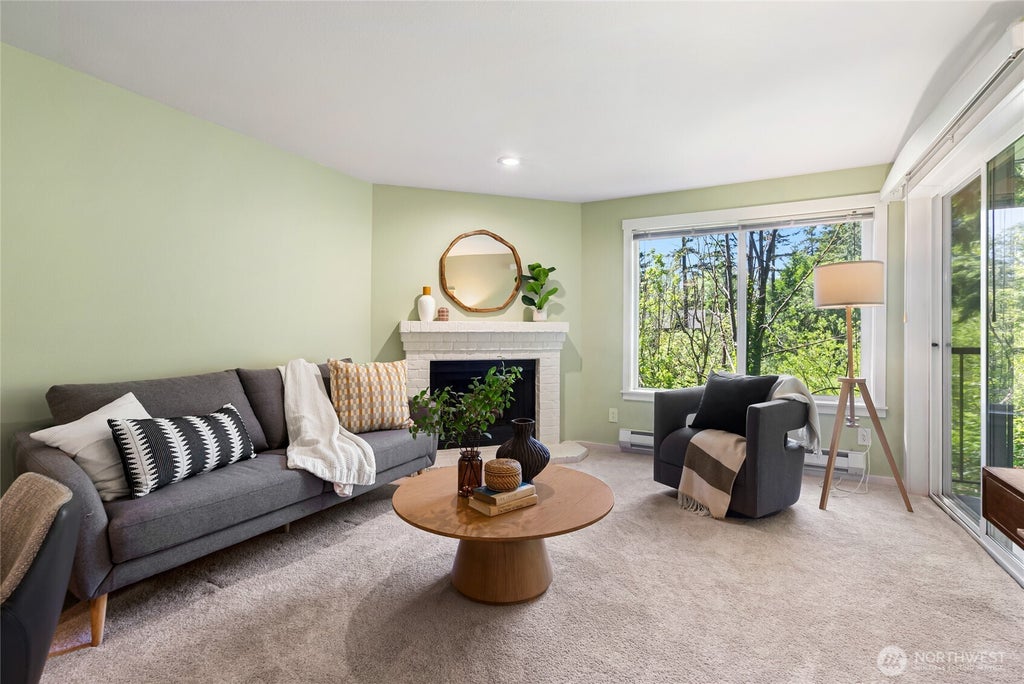 This 2B1.75B unit is the perfect combination of tranquility and convenience. Enjoy your morning coffee on the balcony overlooking a serene greenbelt with plenty of privacy. The open layout and oversized windows fill the home with natural light. Each bedroom features its own closet space and bathroom. Freshly painted with brand-new bathroom countertops. In-unit W/D. Tanager amenities includes an outdoor pool, indoor hot tub, gym, & clubhouse. This unit includes 2 reserved parking spaces & guest parking. Well-managed HOA with low dues, no rent cap, no special assessment—ideal for both investors and homeowners. Minutes to I-405. Walking distance to Juanita HS, Kingsgate P&R, The Village at Totem Lake, and grocery stores. Pre-inspected.