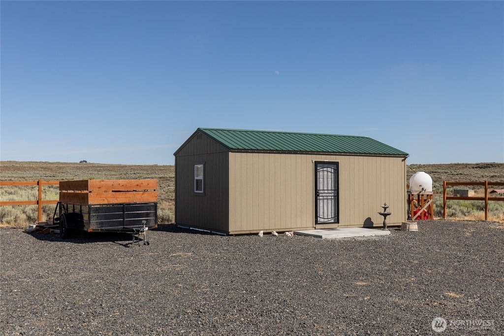 Relaxing vacation property in Rimrock Meadows. 14' x 24' dry cabin with kitchenette. The home has a poured concrete porch and is equipped with security door and windows. Neat and tidy inside and out. Single car garage with a huge concrete patio attached. Storage shed by the RV parking area. Latrine area also has an outdoor shower set up and concrete pad for a generator. Fence around the structures and rocked. Two gated access points to the fenced area. Well cared for, pretty new and clean. Great privacy. Community amenities include a clubhouse with game room, kitchen and laundry, Olympic sized pool and showers, BBQ areas, play equipment for kids, off leash dog area, camping, potable water station, trails and a fire station.