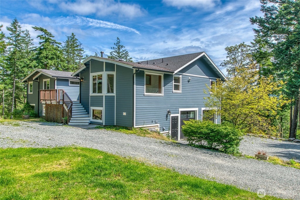 Enjoy eastern views toward Buck Mountain and Mount Constitution from this sunny, spacious home. Main level living, including a primary bedroom with ensuite bath and walk-in closet, a second bedroom, full bath, and a flex room perfect for an office or gym. Light-filled living and kitchen areas open to a generous deck-perfect for relaxing and entertaining. Enjoy a walk-in pantry, laundry room, and half bath just off the kitchen. The lower level offers flexibility with a separate entrance, two additional ensuite bedrooms, full kitchen, living room, office, and a second deck. Garden space, water views, and seclusion complete this multigenerational-friendly property with an attached 2 car garage. Bonus, golf course is close by. Seller financing.