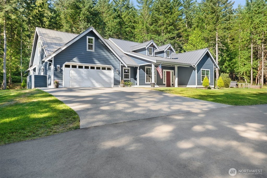 Welcome to this private 9.46-acre PNW retreat just 25 mins from the Bainbridge Island ferry and minutes from the Kingston ferry! This 2019 custom built 4BD/2.5BA, 2843' home blends luxury and off the grid readiness with a whole-house generator, a 250 gallon propane tank, private well, nine foot ceilings, radiant in-floor heating, a rock wall fireplace and chef’s kitchen with granite countertops. There's a Spacious primary suite with ensuite and walk-in closets. Outside you will find an above-ground pool, in-ground trampoline, garden space, a greenhouse, chicken coop, and detached a shop/garage—ideal for hobbies or home business. Gated entry, paved driveway, walking trails, metal roof, and custom finishes. Privacy and acreage can be yours.