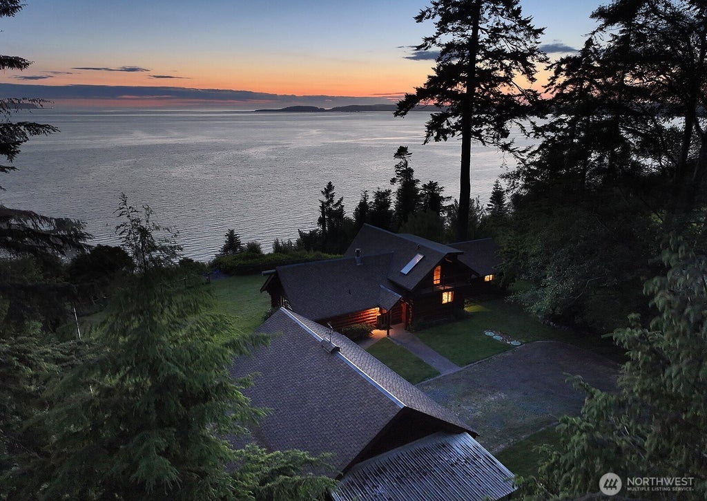 Step into a storybook setting where old-world charm meets natural grandeur. Nestled on over 2 private, forest-wrapped acres, set on over 160+/- ft of west-facing waterfront, this handcrafted log home legendarily built from Whidbey-milled wood, welcomes you with soul & serenity. Unobstructed, 270-degree vistas capture the snow-capped Olympics Mt's, dancing shipping lanes, & jaw-dropping sunsets. A winding drive on a dead-end street, leads to a sunny glade, pristine home w/2 primary suites + office, custom wine vault, fenced garden & planting shed, detached garage w/shop & loft ready for your creative vision. Pristine, poetic, unique & profoundly peaceful, this is where nature whispers & memories are made.