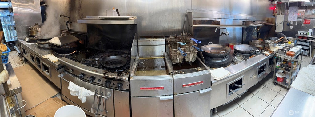 Chinese restaurant located in Asian Mall featuring dim sum & seafood. 24' type 1 Hood with 6 woks & boiler, 2 deep fryers 2 kettle burners, 4 burner stove/oven, griddle. 5' type 1 hood over Won Ton noodle station. Congee Station type 2. Ovens. Walk in cooler & freezer.