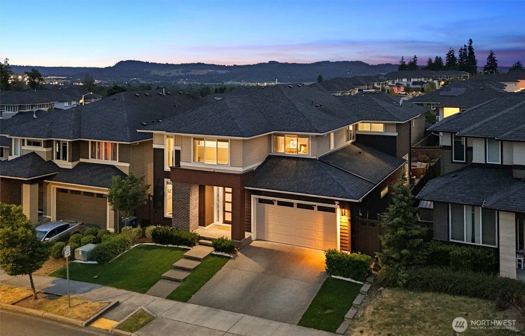 Stunning MAINVUE RESALE w/an impressive, functional floor plan & high-end finishes throughout. Step inside to find a private office, stylish 1/2 bth & a den w/French doors. The open-concept kitchen shines w/a dramatic eating island & Butler’s pantry, flowing seamlessly into the family room w/gas fireplace & spacious dining area. Two slider doors open to a covered deck w/outdoor gas fireplace—perfect for year-round enjoyment. Entertain on the stone patio surrounded by turf, raised flower beds & custom lighting. Upstairs offers a 2nd living room w/Cascade views, 3 bedrooms, full bth & laundry. French doors lead to a luxurious primary suite w/WIC & spa-inspired 5-piece bth. Smart Home system, sealed garage floors, trails, parks & so much more!