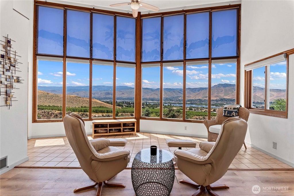 Views! Exceptional architecturally designed home, w/spectacular views from almost every room, set apart from any other house at the top of a hill in an almost pastoral setting, this property is private, one of a kind lifestyle opportunity. Sustainably designed Berm house with "fire wise" timeless metal roof, siding, & gutters no painting needed establishing great value. Euro-style modern kitchen for Chef & guests. Both the living room & primary bedroom suite have stunning 14 ft windows w/heat & cooling sinks built into floors, w/ceiling fans to distribute either warm or cool air, new blinds & screens every window! Energy efficiency & stylish home w/high-end heating electric fireplace. One Level Living Life Well! County maintains paved road!