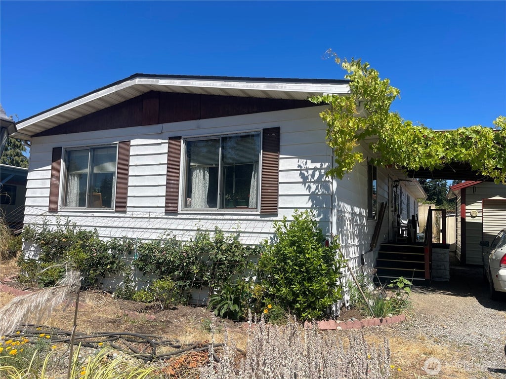 Affordable, spacious home with full size living room and great room off the kitchen with peninsula. Good light throughout. Formal dining and an office off the side entry with the carport. It is warm and inviting and in very good condition inside. New/newer metal shed and another one behind. HUGE greenhouse in the back of the property and tons of plantings just needing loving care. Wait until you see the grape arbor! Lush juicy grapes coming your way. Park rent is $790 and 2 indoor pets allowed.