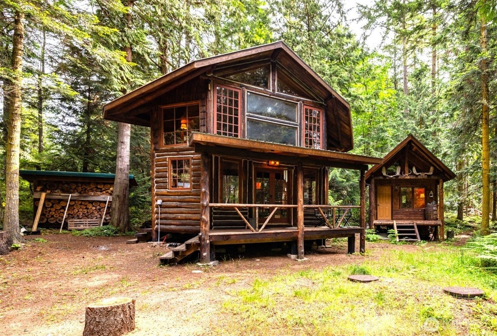 Tucked away on private Center Island, this enchanting log cabin is perfect for someone wanting a one-of-a-kind getaway. Cozy interiors with rustic charm, unique details, central wood stove, and panoramic windows bring nature inside. A darling detached guesthouse with half bath offers extra space for guests or creative pursuits. Carport and tool shed provide shelter for your projects and included golfcart. Perfect for weekend getaways, artistic inspiration, or a secluded lifestyle. Your serene island sanctuary awaits! Fully furnished and ready to enjoy. This is a very special place! Community shares two deep water docks, private airstrip, clubhouse, and full-time caretakers. Broadband coming available soon. Very easy access by water taxi.