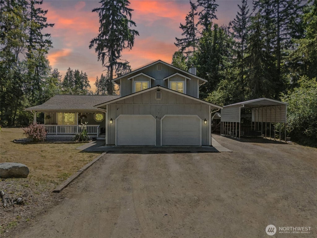 Tucked away in peaceful Gig Harbor North, this refreshed 3-bedroom, 2.5-bath home sits on just under 2 acres of usable land. Inside, enjoy vaulted ceilings, exposed beams, and a light-filled kitchen with quartz countertops, white shaker cabinets, and stainless steel appliances. The layout offers multiple living spaces, a stylish laundry room, and warm finishes throughout. Outside, you'll find a detached shop with power and 240V hookups, a 2-car garage, covered RV/boat parking, and a large covered patio—perfect for work or play. Septic system with public water. No HOA. Minutes to Hwy 16, Costco, and local amenities.