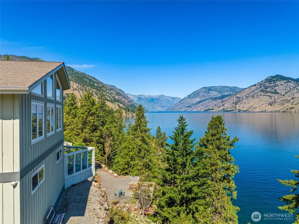 First time on the market. Extraordinary and Unique Waterfront home located near 25 Mile Campground and Fields Point on Lake Chelan's South Shore. 1.58 acres, 367ft of private waterfront with 2 coves. Large Private Dock with Boat Lift and Jet ski Lift, and lit pathway. This property features a one bed loft with soaring ceilings, and 180-degree Lake Views. Extra Large attached garage with lots of natural light, bathroom, work bench, and has plenty of room for multiple cars, boats, and storage. There are 4 large tough sheds on site for plenty of additional storage, one includes insulation, power, and heat. Exterior annex with kitchen area, BBQ and seating. Expired architectural plans for Un-built Main home included with property.