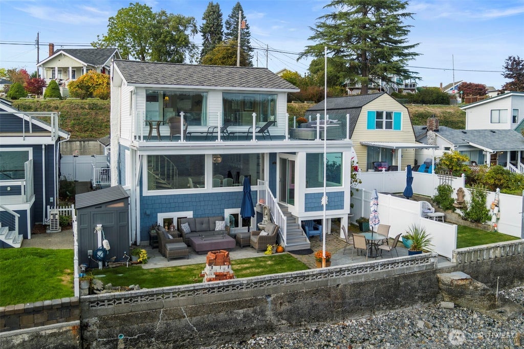 Remodeled & updated 2 story (+ basement) no bank 180 degree view waterfront home in Manette. Easy access to downtown restaurants, bakeries and other local amenities including PSNS and Seattle ferries making this property an ideal vacation home and/or vacation rental. Maintenance free property with 4 steps to the beach, fully fenced with sprinkler system. Upstairs primary bedroom has a private wrap around deck. Main level offers a bedroom and bath plus den and an outdoor patio area w/ counter space & BBQ area. Kitchen has 2 ovens & large island w/ 2 dual zone wine fridges. Basement has large workshop, bonus rm & storage. One car carport + 2 parking spaces in front of home with additional parking available just a few feet away.