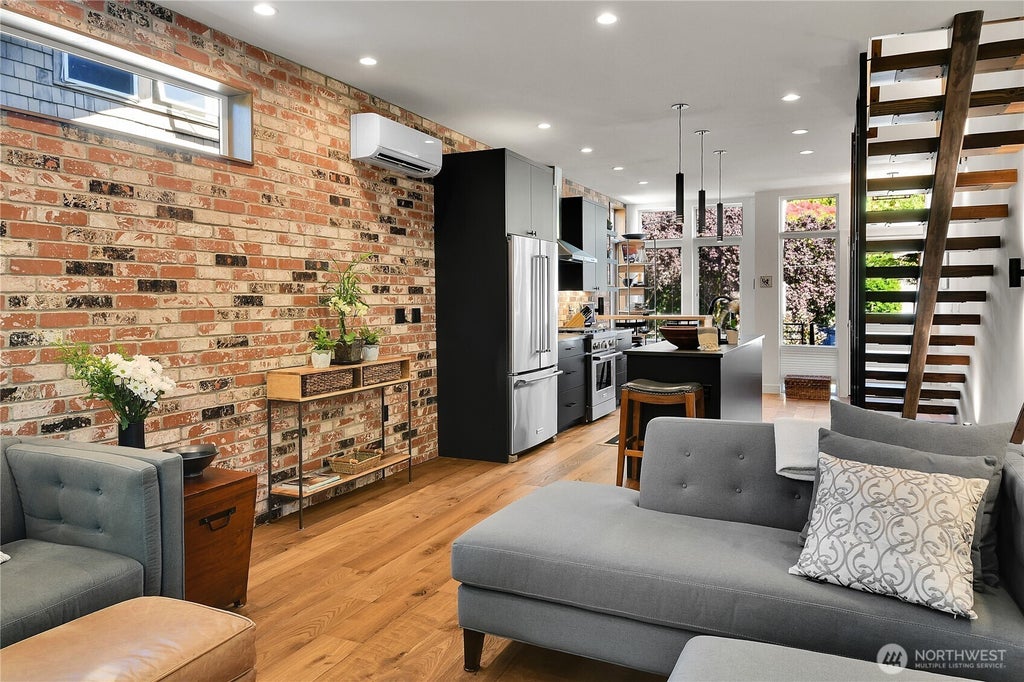One block from Lake Union, this rare end-unit at The Nest – a sophisticated Eastlake brownstone community – blends East Coast inspiration with bold, PNW style. Industrial cool meets refined design: glass staircase, black quartz counters, brick accents & elegant hardwoods capture the feeling. The top floor is its own retreat with stunning walk-thru closet, part of a spa like ensuite. Three more bedrooms offer space for guests, work or hobbies. The lower level, presently a home-office, features a potential ADU. Step outside to your own private garden space. The rooftop offers privacy and expansive views unique to this home, perfect for intimate entertaining on these lovely Seattle summer evenings. Covered parking & AC included. Welcome home.
