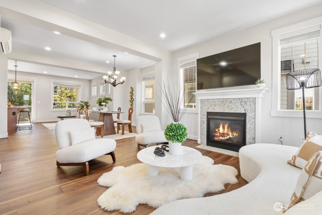 This large corner unit townhome in the heart of Issaquah Highlands offers you easy living at a great location, near shops, restaurants, parks, trails, cinema & all amenities. Home boasts abundant natural light and amazing views of mountains & sunset. Main level features brand new flooring, gas fireplace, chef's kitchen with SS appliances, A/C, and sliding door to covered deck. Primary suite on upper level has walk-in closet and luxurious bath. Huge top floor bedroom can also be rec room, office or gym. Lower level private junior suite is perfect for guests, or multi-generation living. New carpet. Community park nearby is great for outdoor leisure. Minutes to I-90 and Park & Ride. No rental cap. Home is pre-inspected and move-in ready.