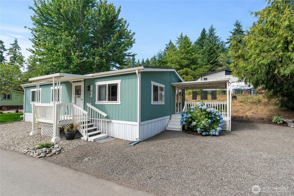 Beautifully updated home in an all-age park! This home offers a spacious covered deck & well-maintained lawn, providing inviting outdoor living spaces. The interior is filled with natural light & features an open floor plan, including a large kitchen with butcher block counter, island breakfast bar, new lighting & fixtures, laminate flooring & access to the deck. Primary bedroom has walk-through double closets & bath with walk-in shower. Updates include new vinyl windows, fresh interior & exterior paint, renovated bathrooms, all appliances, metal roof, heat pump for AC & parking for 4 vehicles, including a carport. The property is ideally located on a quiet, dead-end street near shopping centers, military bases and Central Kitsap schools.