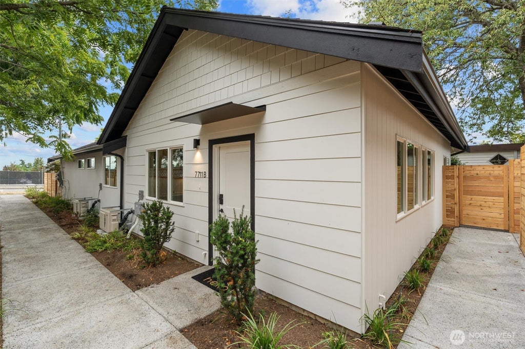Sleek New Home with Private Yard! Tucked behind a lush, secluded entrance, this 1-story modern new construction feels just like a single family home. Open layout w/ vaulted ceilings, sunlit interiors & engineered hardwoods throughout. Chef’s kitchen boasting quartz counters, ample cabinetry, breakfast bar & upscale finishes. The spa-like bath includes luxury floor-to-ceiling tile, heated floors & vaulted ceilings. Both bedrooms overlook the fenced, low-maintenance yard, shaded by a cherry tree & complete with a sprinkler system-ideal for relaxing, entertaining, or pets. Parking w/ EV charging. Mini-Split for heating/cooling. Plywooded attic for storage. Built Green. Potential buyers can request to meet w/ the Builder. Prime central location