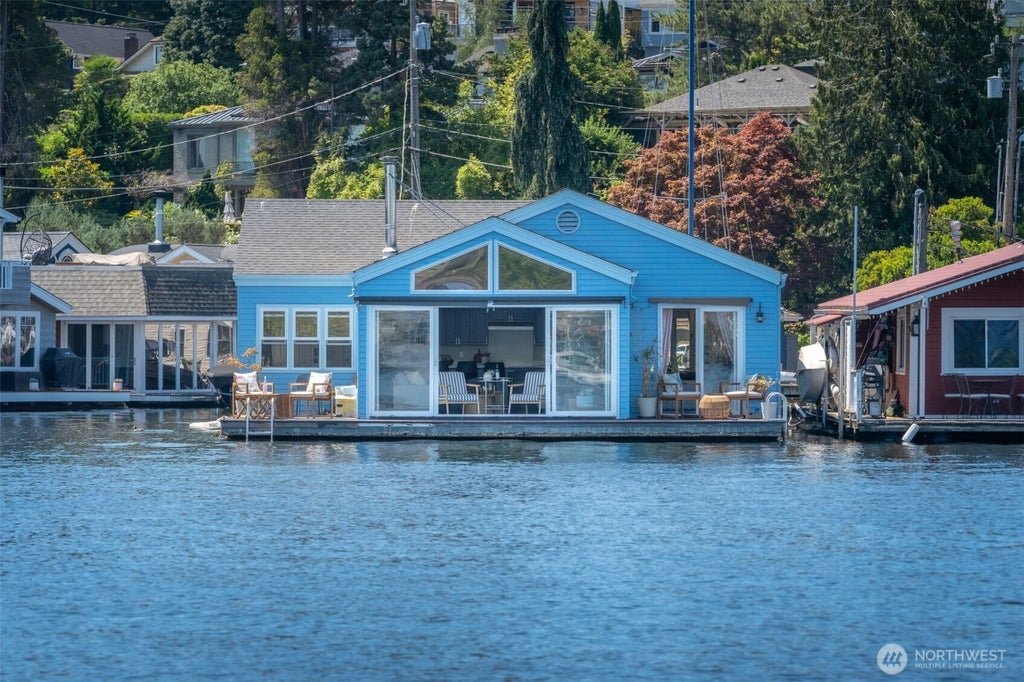 Extraordinarily rare Seattle floating home with stunning unobstructed water views on three sides, with private marina and boat moorage included. Expansive living room and open eat-in kitchen with beautiful, vaulted ceilings. All main floor living, a very rare find, has gorgeous hard wood floors. All the bedrooms have panoramic views and brand-new windows. Enjoy watching winter migratory birds arrive at your head-to-toe windows. 38' of low-bank bulkhead waterfront and two outdoor seating areas, including one with access directly from the master bedroom through sliding glass doors. All new interior and exterior paint. Designed by architect Eric Hogeboom. Home comes with a boat slip.