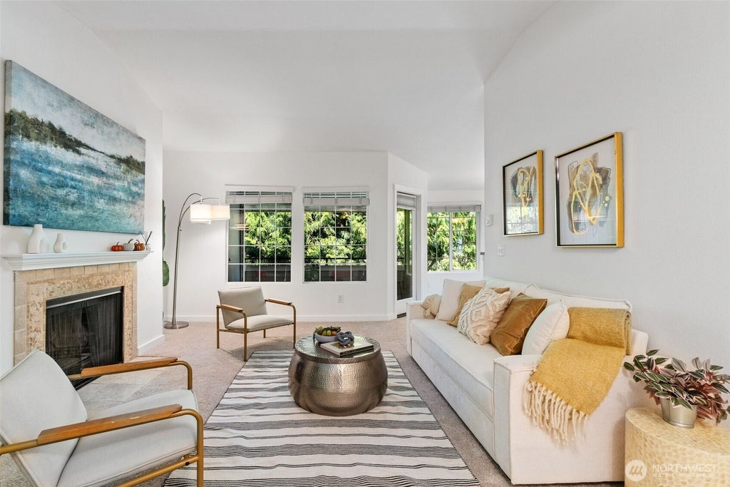 Discover comfort & convenience in this top-floor condo at Esplanade in Kirkland. Nestled on a quiet street in the heart of Juanita, this 1 bed/1 bath home features vaulted ceilings for an airy, open feel. Living room boasts a cozy wood-burning fireplace & is open to dining area & kitchen. Spacious bedroom includes a walk-in closet. Private balcony (w/ storage space) overlooks a peaceful stream, perfect for relaxing. In-unit washer/dryer & reserved covered parking for convenience. Updates include fresh paint & new carpet throughout. Community amenities include a pool, spa, clubhouse, & gym. Ideally located near Juanita Beach & Bay Park with easy access to I-405, eateries, markets, shopping, Google, Downtown Kirkland & more. No rental cap!