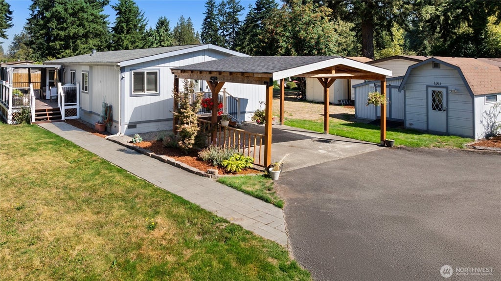 This beautifully newly remodeled 3-bedroom home blends style & comfort w/ over 1,500 sq ft & an open floor plan. Upgrades include fresh interior/exterior paint, laminate & tile flooring, & fully renovated bathrooms with modern fixtures. The kitchen shines with updated counters, backsplash, and newer appliances. For efficiency and peace of mind, enjoy a whole-house generator (2020), pellet stove (2021), and permitted electrical panel. Double-pane windows and a Murphy bed add value. Outside, the largest lot in this all-ages park features a brand-new carport and spacious shed. Conveniently located near Lakeland Town Center, top-rated Dieringer schools, and just minutes to Auburn or Sumner train stations. Pre-inspected for your peace of mind!!